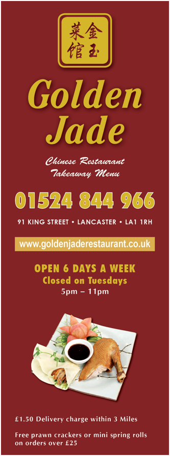 MENU HOME FRONT PAGE PAGE 2 PAGE 3 PAGE 4 PAGE 5 PAGE 6 PAGE 7 PAGE 8 HOME Golden Jade. 91 King Street, Lancaster. LA1 1RH Tel 01524 844 966